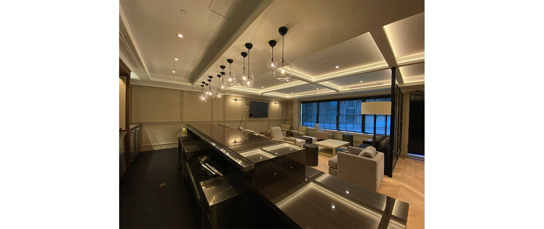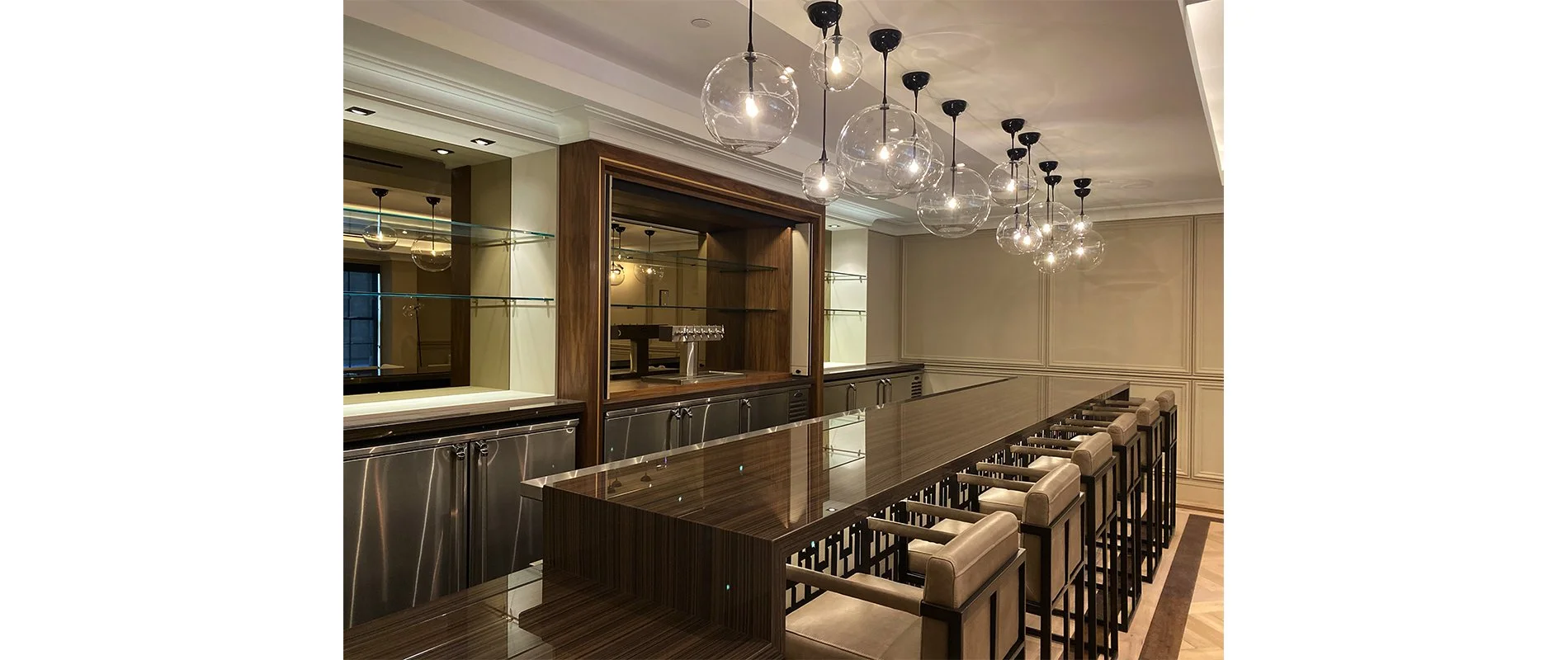 At the heart of the lounge, a sculpted bar anchors the room with tailored symmetry. Framed by floating glass shelves and a mirrored back wall, the custom walnut bar millwork is clad in a geometric blackened metal screen—a modern nod to vintage mountain motifs. Above, a constellation of hand-blown globe pendants glows softly, casting patterned reflections across the high-gloss bar top.