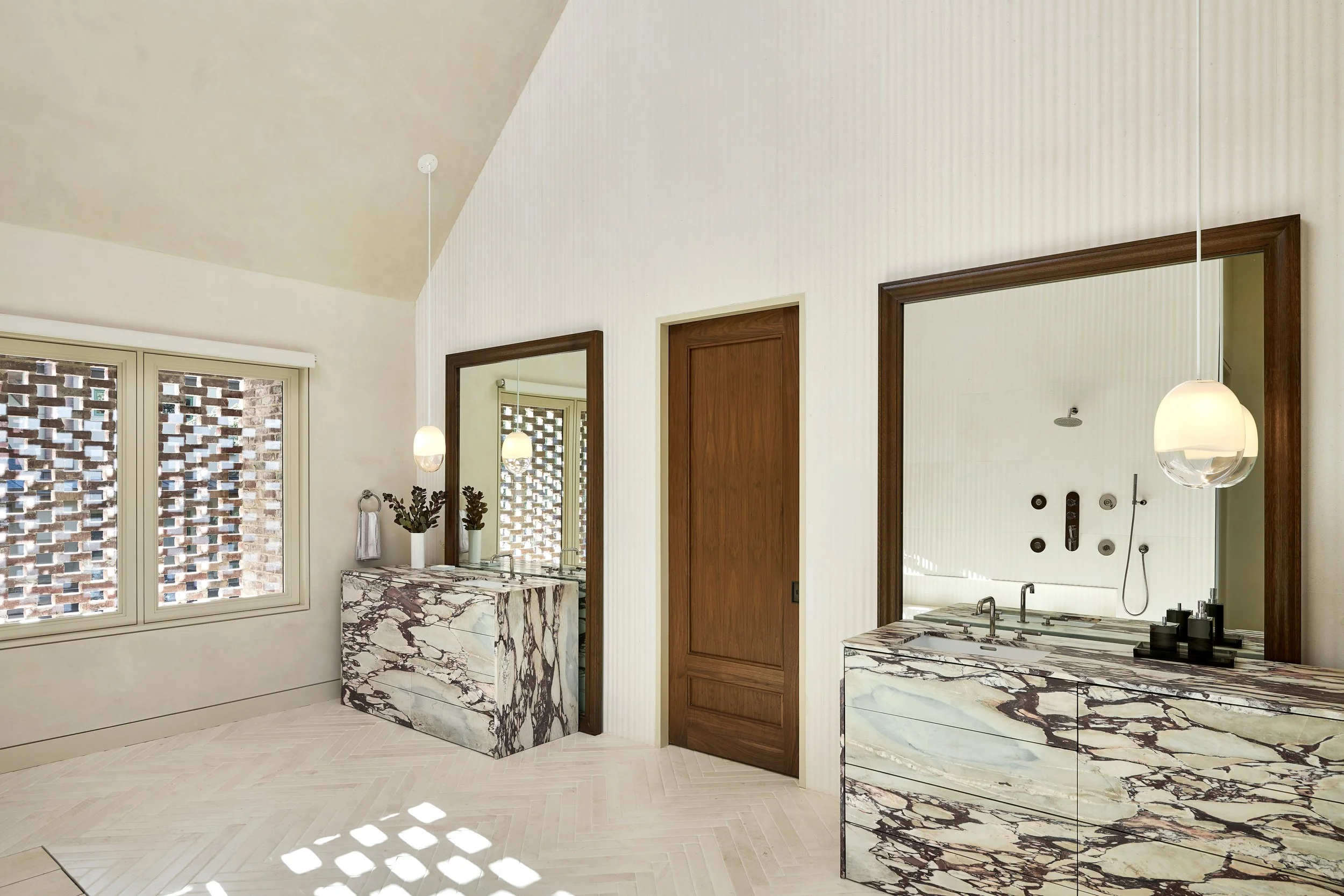At the flanks, honed Viola marble vanities are carved like monoliths, each veined in deep oxblood and mineral greens. Wall-hung mirrors framed in walnut are flanked by pendant orbs of glass, suspended delicately like droplets of light. The herringbone floor continues underfoot, elongating the space and unifying the suite with quiet continuity.