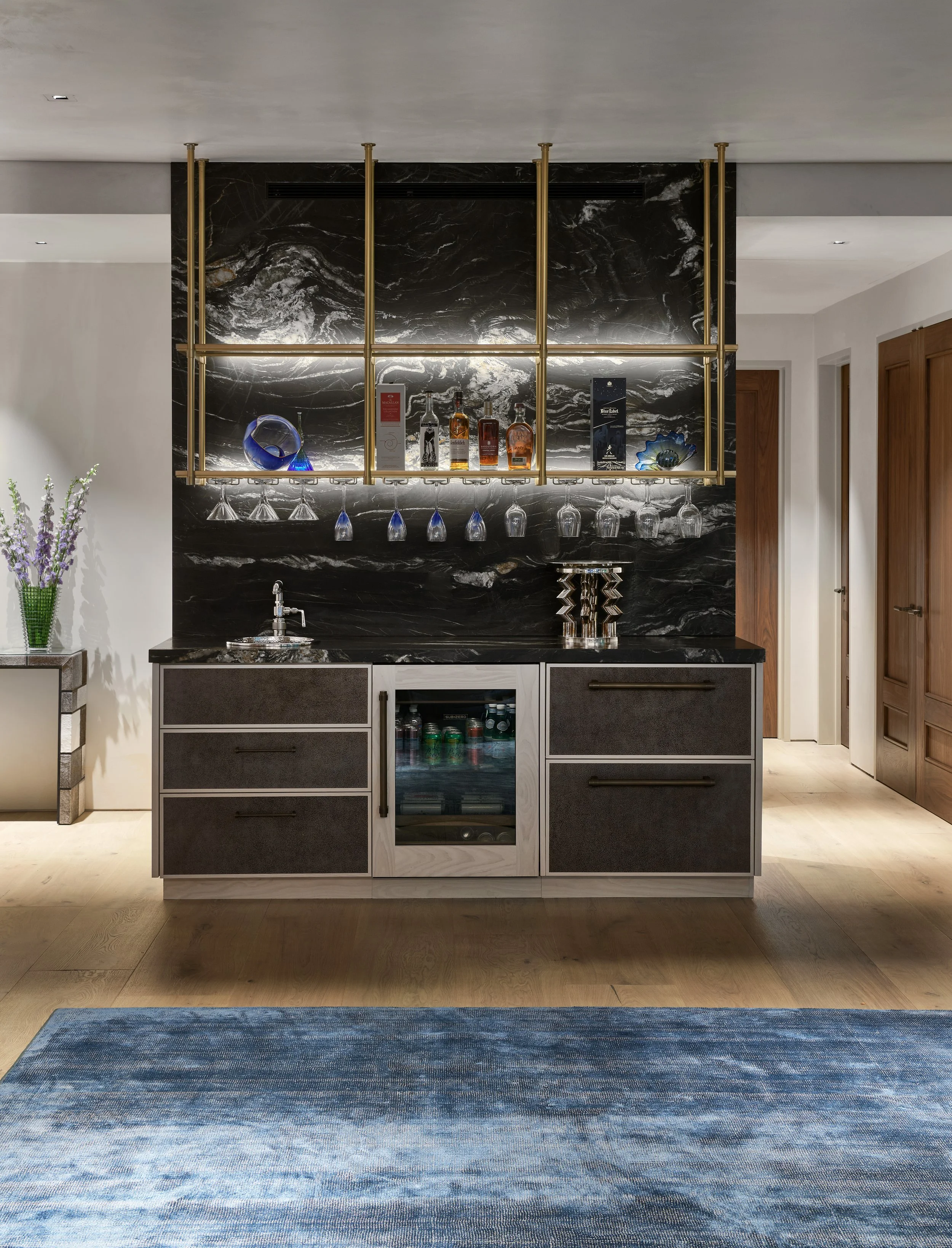 Adjacent, a fully integrated bar anchors the space with cinematic gravitas. Polished black stone veined in stormy white becomes both backdrop and statement—its surface alive with movement, its presence undeniable. A custom brass shelving system hovers elegantly above, suspended like a piece of fine jewelry, framing spirits and crystal alike in a vignette of decadent restraint.
